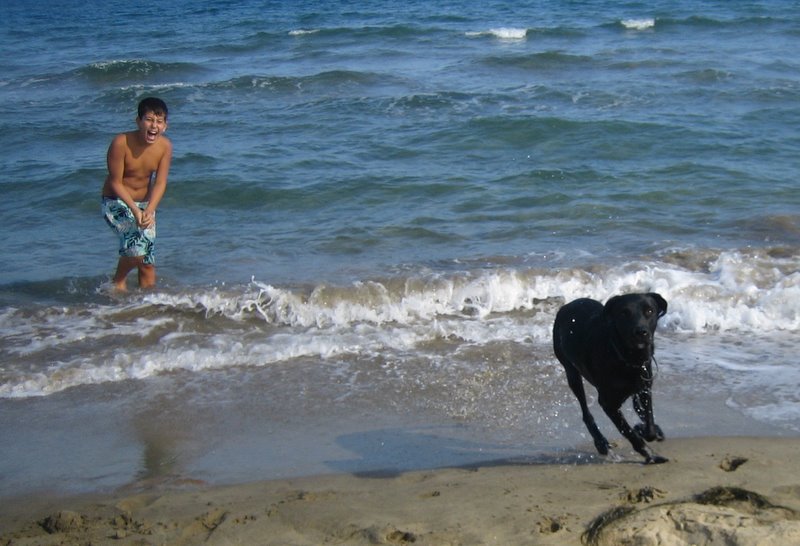 | Un petit tour à la plage avec Moopy qui se régale dans les vagues.. |