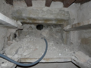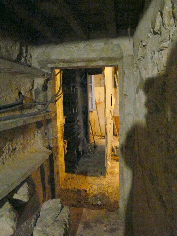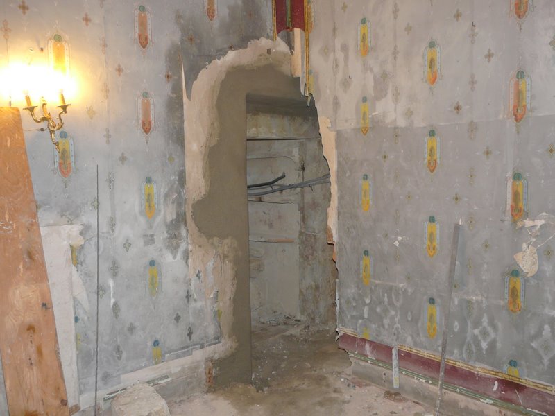 | Sondage de l’ouverture entre la cuisine et la cave, on découvre un linteau et des montants |