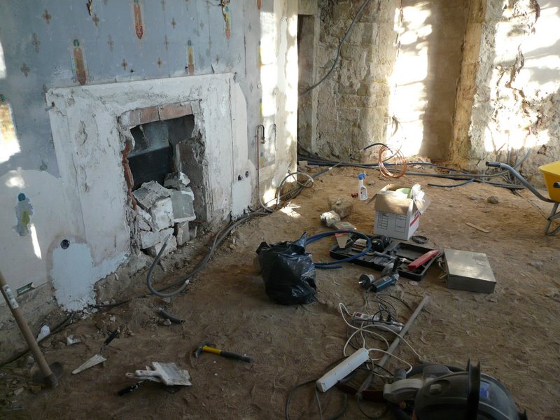 | Travaux de préparation (réseaux) dans la future cuisine… C’est très long !!! Eau, gaz, électricité, téléphone, évacuations… etc… Il ne faut rien oublier… |