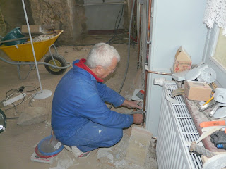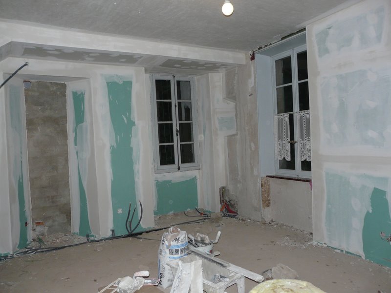 Le plâtrier est à l’œuvre, il termine la cuisine répare les trous, consolide ou insonorise des murs, change des portes de place et à l’occasion décore le sol de ses grands pieds blancs….