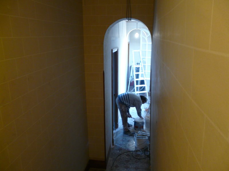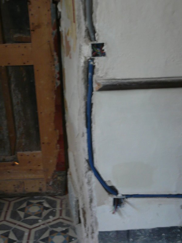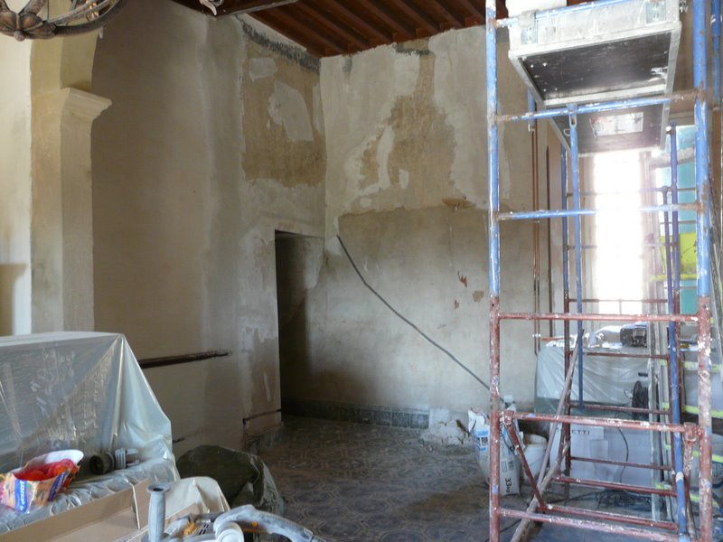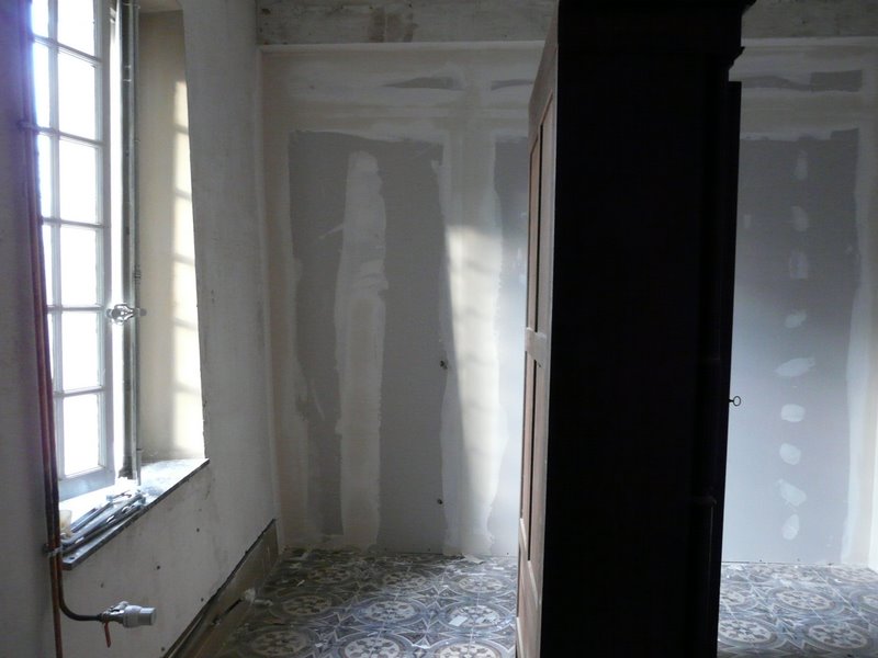 Le plâtre est terminé, l’électricité de la salle à manger est installée, la souillarde a son carrelage, la future cuisine a bien avancé, mais pendant quelques jours, le rez de chaussée n’était plus habitable… Un peu dur de manquer d’espace dans un château !!!