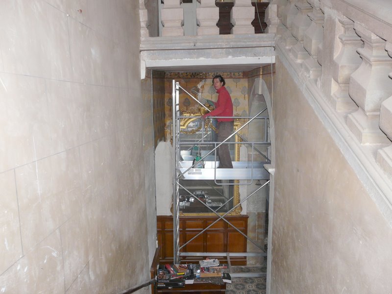 | Dominica sur le nouvel échafaudage, enlevant le papier peint de l’entrée |
